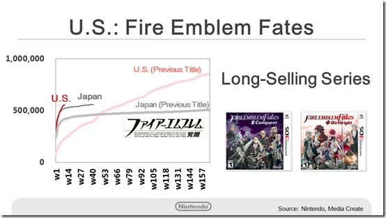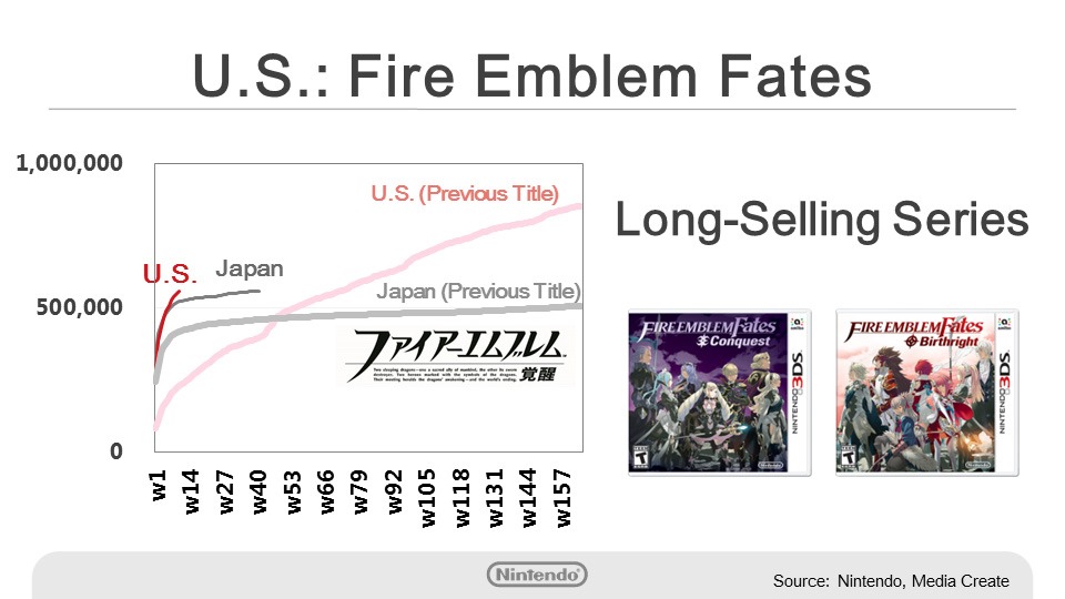 This graph adds a comparison with the previous entry in the series, Fire Emblem Awakening. As you can see, there are major differences in the trends in the Japanese and American markets. In Japan, most of the demand is filled within the first few weeks after launch, but the Fire Emblem series continues to perform well over a long period in the U.S. In the past, the Fire Emblem series did not sell as well in the U.S. as it did in Japan. However, Fire Emblem Awakening greatly expanded the user base for the series, and the current entry, Fire Emblem Fates, has been popular abroad as well since launch.