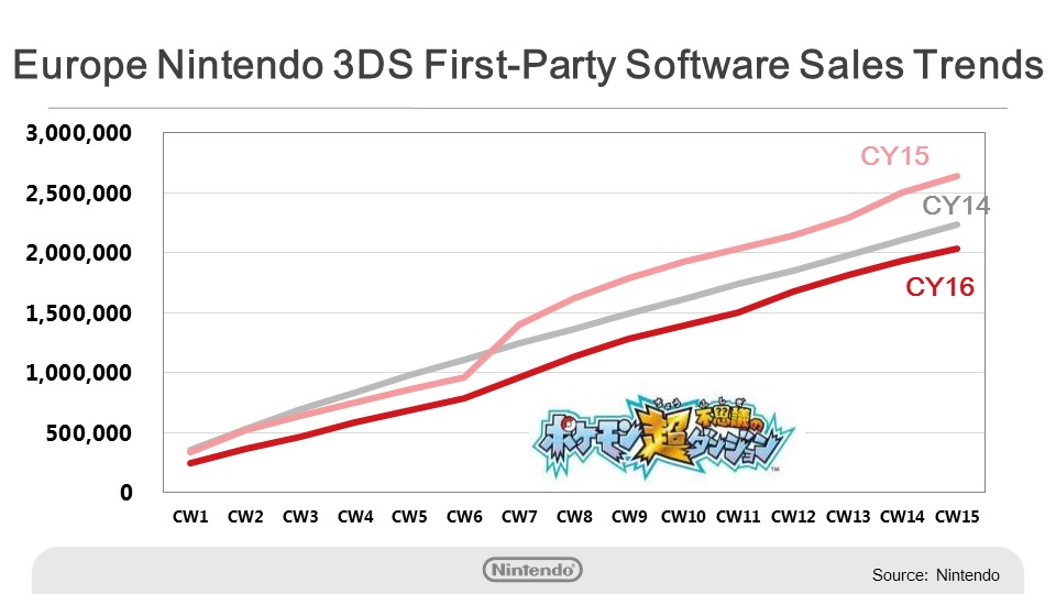 This graph shows the Nintendo 3DS first-party software sell-through in Europe, compared with the same period over the last two years. In Europe, Pokémon Super Mystery Dungeon was released in February, and Nintendo Selects was kicked off last October. These titles continue to perform well, but the sales trends for first-party software as a whole remain slightly under the trends for 2014. We plan to release Fire Emblem Fates in Europe in May.