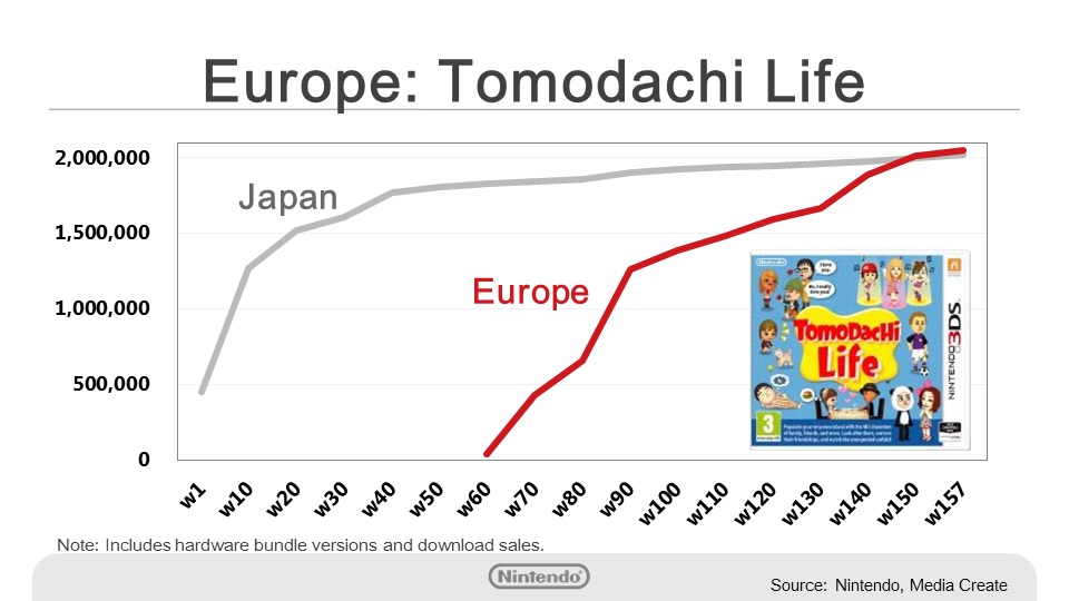Tomodachi Life has been a major title that recently surpassed two million sales in Japan. In the European market, this title was localized into various languages, and was launched in June 2014. Since then, we have seen excellent long-term performance from this title, and it has gradually closed the gap over the last two years, recently surpassing the sales in Japan. There are few titles competing in this space within the industry, and we believe that bringing out the full potential of this kind of title, which appeals to female consumers, will help our products be enjoyed by wider consumer demographics.