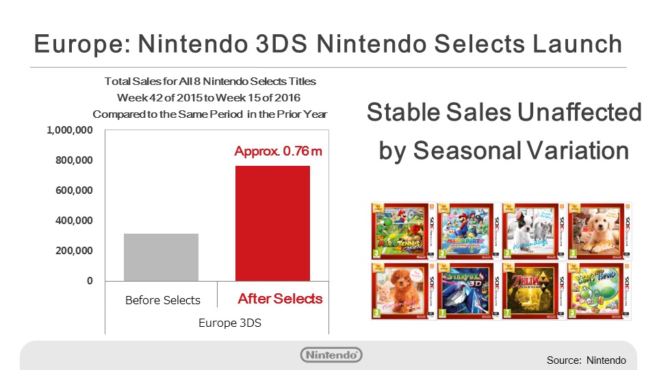 At the last financial briefing, we discussed the strong performance of the Nintendo Selects discount titles, which were launched in October in the European market. This sales performance has not seen much impact from seasonal variation, as these titles have continued to sell well since the start of the calendar year. The red bar in the graph shows the total sell-through for the eight Nintendo Selects titles, while the gray bar represents the total sell-through for the same titles over the same period one year before. The Nintendo Selects titles have achieved total sell-through of over 700,000 units. By changing the value prospects for the consumer, we have been able to reach a wider audience, even for titles that had seen a lull in sales.