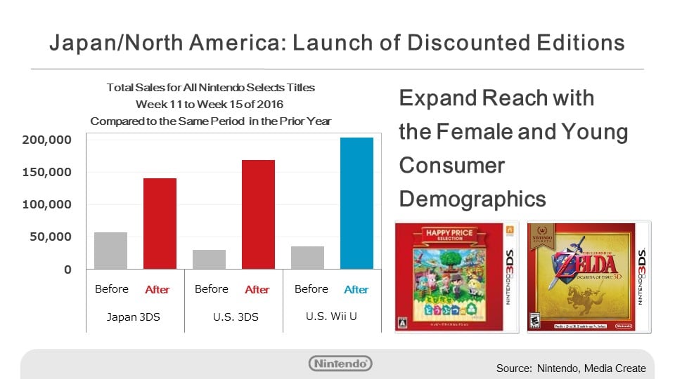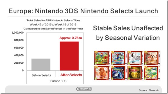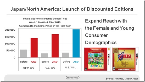 We have also launched similar promotions in Japan and the U.S. In Japan, the title is “Happy Price Selection.” Compared to the sell-through for the same period in the prior year, sales have increased greatly and the ratio of female and young consumers has risen, expanding the audience for these titles. Nintendo feels it is important to provide good value to our consumers without devaluing the overall price of our software. Therefore, we will not overuse these types of promotions, but we do feel these discounts can provide an excellent chance for consumers to find fresh discoveries among our rich back catalog. These promotions will be part of our efforts to maintain the popularity of the Nintendo 3DS platform in 2016 and beyond.