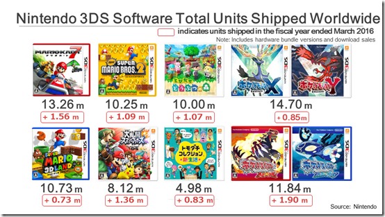 Nintendo recently shared plenty of info in their financial results briefing for fiscal year ended March 2016. Here’s some data on their 3DS software and hardware sales.