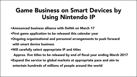During a financial results briefing, Nintendo president Satoru Iwata touched briefly upon the company’s partnership with smartphone game maker DeNA. As previously reported, Nintendo and DeNA will collaborate to produce .titles based on Nintendo I.P. for smartphones. “Regarding the number of the titles, you may want to know that we will release approximately five titles by the end of the next fiscal year, which is the end of March 2017,” Iwata said to investors and analysts. He continued, “You may think it is a small number, but when we aim to make each title a hit, and because we want to thoroughly operate every one of them for a significant amount of time after their releases, this is not a small number at all and should demonstrate our serious commitment to the smart device business.” “We will strive to expand this business into global markets at a steady pace so that eventually we will entertain hundreds of millions of people all around the world. We are aiming to make this one of the pillars of Nintendo’s revenue structure.”
