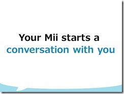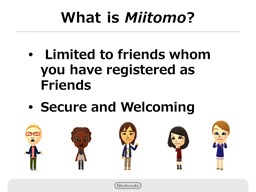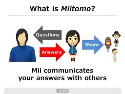 The name of our new membership service is “My Nintendo.” My Nintendo will work as a bridge between dedicated game systems and smart devices. Now, I would like to introduce you to a free-to-start type communication application for smart devices, namely, our smart device application, which can be started for free and will push forward the My Nintendo membership service. Miitomo: