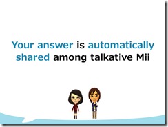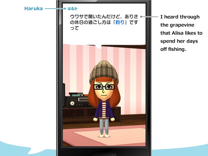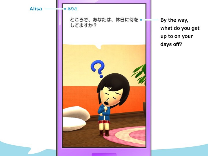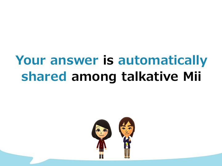 The main character of Miitomo is you. First, you create your own Mii. The Mii asks you a variety of questions and communicates your answers with your Friends’ Mii.