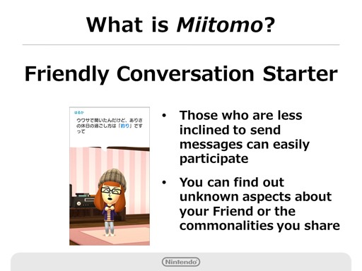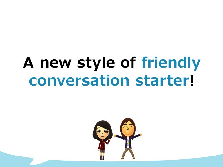 In this way, instead of the users proactively sending their own messages, Miitomo has a unique characteristic that can be called “friendly communication starters” as your Mii will automatically dispatch the answers you gave to certain questions to your friends. These “friendly communication starters” have an advantage that even the people who are less willing to send messages can easily participate. Another unique characteristic of Miitomo is that you may be able to find out unknown aspects about your friends or unexpected commonalities you share with your friend because Miitomo may pick up the topics that you usually do not discuss but would be willing to answer if asked. What we would like to realize is, through such communication, you will be able to deepen friendly relationships and have more people with whom you can play games. Both My Nintendo and Miitomo will be available in March 2016. For reference, more than 200 million Mii characters have been created on our platforms, which means that many people around the world understand the appeal of Mii.
