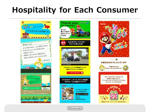 Also, in accordance with each member’s profile, purchase records and play records, we will send notices and gifts. For example, an Animal Crossing character called Isabel may send some information or a present to those who are playing with that game, Mario Kart players may receive a notice about add-on content and we may also send a message that enables the recipient to purchase some software at an attractive price point on his or her birthday. New Point Program: