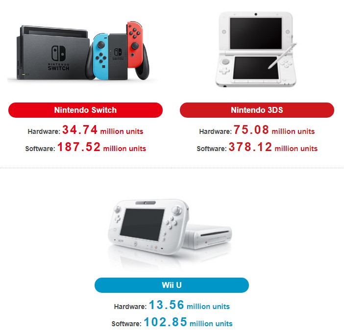 Nintendo shared the latest details from its quarterly financial results, where we got a look at some updated numbers for hardware sales, which has the Nintendo Switch at a new total of 34.74 million units sold worldwide. Here’s a look at the updated sales figures for the Nintendo Switch, 3DS, and Wii U: