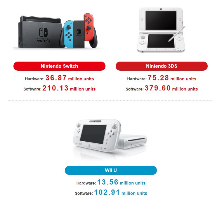 Nintendo released their latest quarterly financial results with updated numbers for hardware sales. The Nintendo Switch console reached 36.87 million units in worldwide sales as of June 30, 2019. Here are the updated total unit sales for the Nintendo Switch, 3DS, and Wii U: