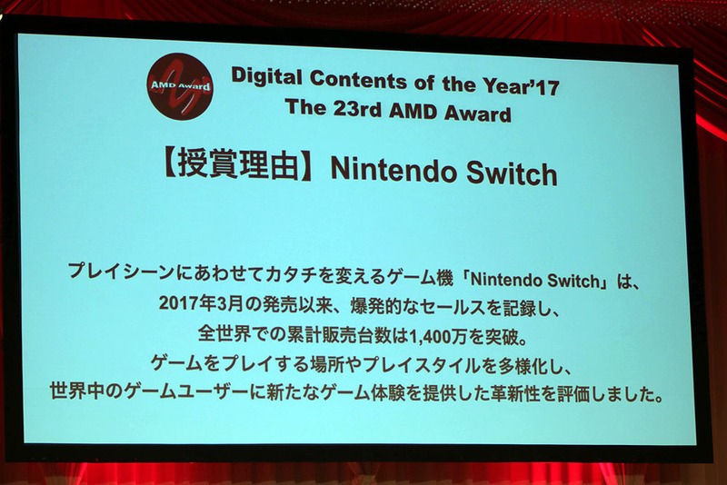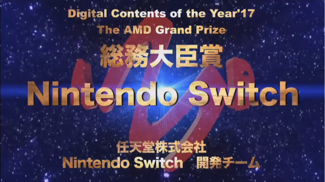 At the recent 23rd Association of Media in Digital (AMD) Awards, the Nintendo Switch won the Digital Contents of the Year ‘17 AMD Grand Prize. (Thanks, Game Watch!)