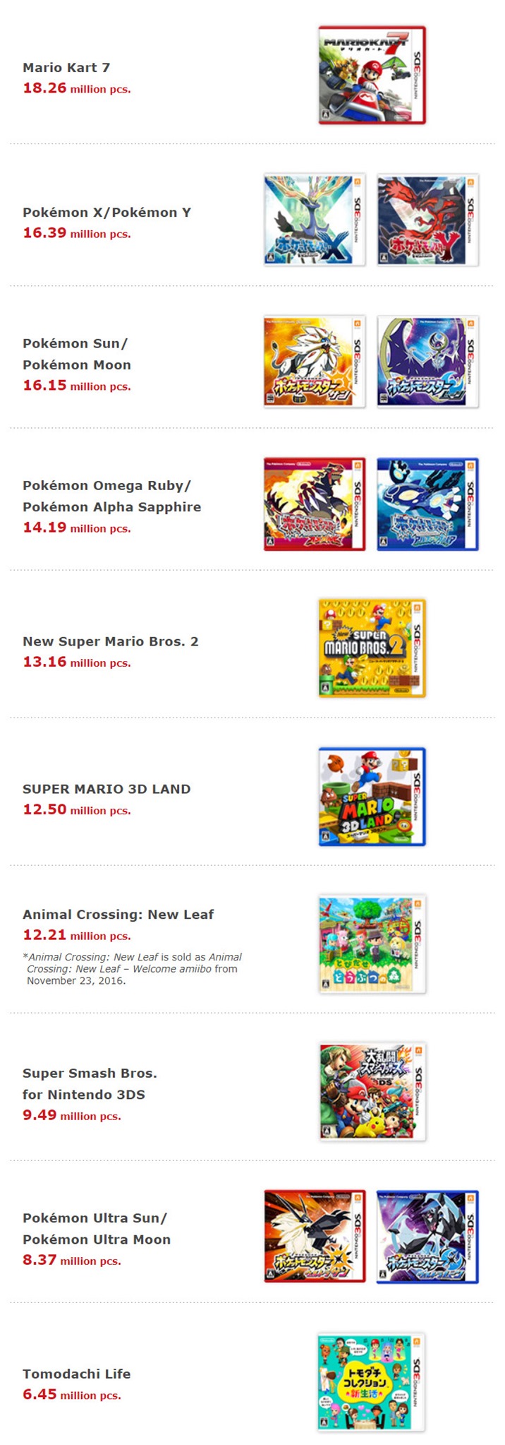 - Pokémon Sun/Pokémon Moon – 16.15 million pcs.