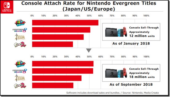 This chart compares the console attach rate for Nintendo evergreen titles in January and September of this year. As the chart shows, there was no significant change in the console attach rates for these four titles even though there was a combined sell-through of roughly 6 million systems in Japan, the US, and Europe over the course of that time. This implies that these titles are continuing to sell at a sustainable rate, and at the same pace as the hardware. We can expect the evergreen titles to continue to sell as long as the hardware continues to sell.
