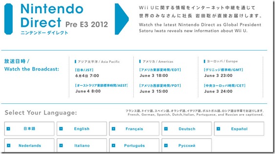 Nintendo have announced three separate pre-E3 Nintendo Direct presentations—one for the Americas, one for Japan, and one for Europe. These will kick off tomorrow, and will have Nintendo discussing the concept behind the Wii U. Take a look at the schedule below or on this page.