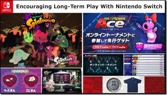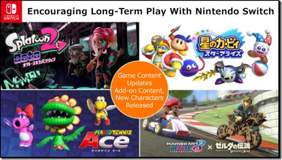 One initiative involves the continual updating and delivery of add-on content for games. For example, titles like Mario Kart 8 Deluxe and Splatoon 2 that were released last year have gotten more updates since April of this year with additions to game elements. And titles like Kirby Star Allies and Mario Tennis Aces that were just released this year have been updated for free