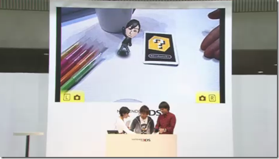 The final third of the segment focused on AR Games (Augmented Reality) games. The first demo showed the camera pointing at a specially designed Nintendo “?” card set on a surface, with the 3DS then superimposing a Mii character onto the card on the screen. Also on the table were a cup and colored pencils. The 3DS detected these objects, and when the Mii starts moving, it could collide with the cup or colored pencils, showing the sophistication behind the 3DS’s camera. They demoed this AR game again by having Kosuke Kikuchi hold the card on his arm, with the Mii appearing above the card on the 3DS screen.