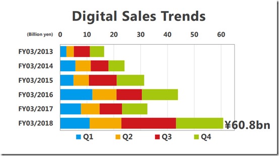 This graph compares the sales of digital content through our dedicated video game platform business over the past few years. To reflect these changing circumstances, what we used to refer to as “download sales” are now called “digital sales.” Our digital sales reached a new record high in the fiscal year ended March 2018. We are not disclosing the specific breakdown, but downloadable versions of packaged software and add-on content for Nintendo Switch did make a major contribution to growth in digital sales. Note: FY = Fiscal year (April through March of the following year)