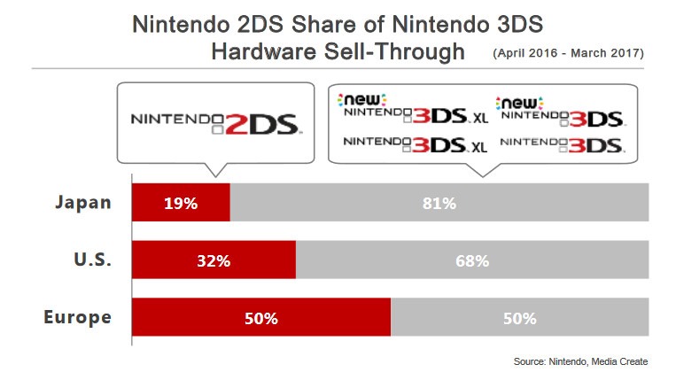This graph shows the share of Nintendo 2DS within the total Nintendo 3DS hardware sell-through per region. Nintendo 2DS launched last year in the Japanese market. We reduced the price in the U.S. market in May of last year and saw an increase in sales that exceeded our expectations. We announced during our corporate management policy briefing in February that the share of sales of Nintendo 2DS is increasing. As you can see, while there are differences between regions, we have been able to leverage the product variation in the Nintendo 3DS family of systems.