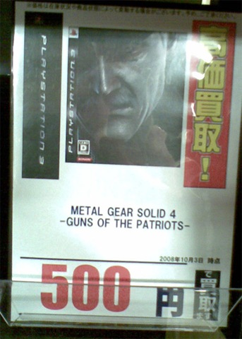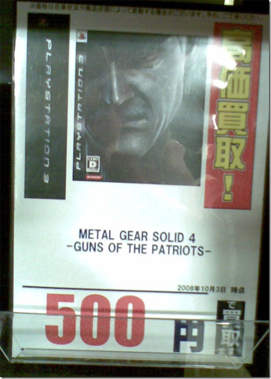 Tsutaya Shinjuku is having a fire sale on used copies of Metal Gear Solid 4 where you can buy a pre-owned copy for a mere 2,480 yen. Even with the economic downturn that’s still only $24.50. A brand new copy at the same store goes for 6,980 yen ($69), a break from Konami’s suggested retail price of 8,800 yen ($88). Oh, and if you’re planning to sell your copy of Metal Gear Solid 4 don’t bother in Shinjuku.