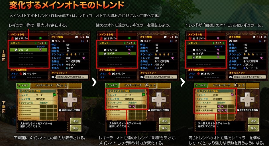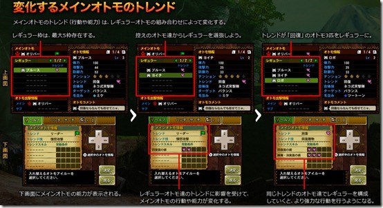 In Monster Hunter 4 you will always have a Main Felyne, along with Regulars. The Regulars will consist of five selected Felynes, who will have their own Trends, while the Main Felyne’s Trend will completely depend on the Trends of your Regular Felynes. For example, having three Felynes with the Healing Trend will also give the same trait to your Main Felyne, but it can also be more effective depending on how many Regular Felynes you have with matching Trends