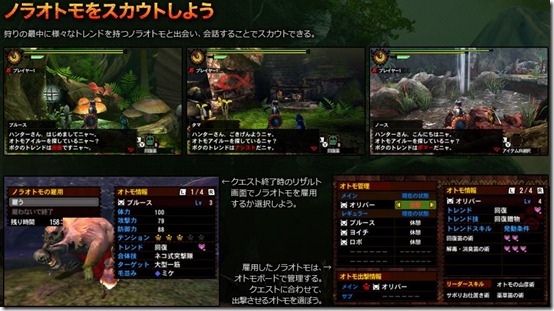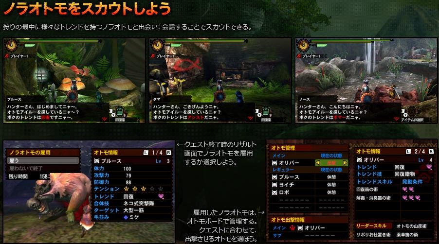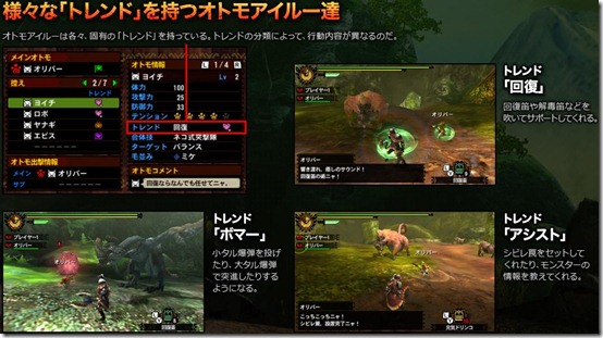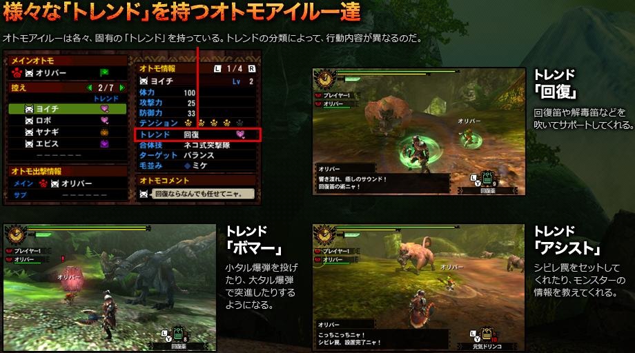 Now, it wouldn’t be fair for the Hunters if monsters were the only ones getting stronger. Monster Hunter 4’s Felyne Comrades will be more useful than ever to help fighting against the tough monsters. The Felynes have characteristic traits, called Trends, that shows their preferred actions and abilities. The above images shows three Trend examples: