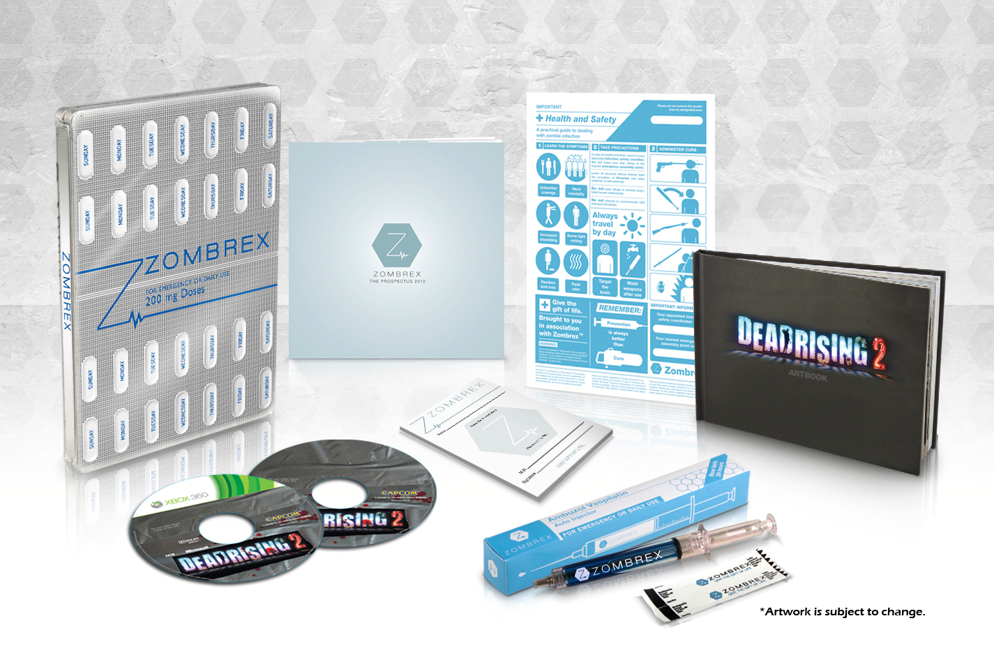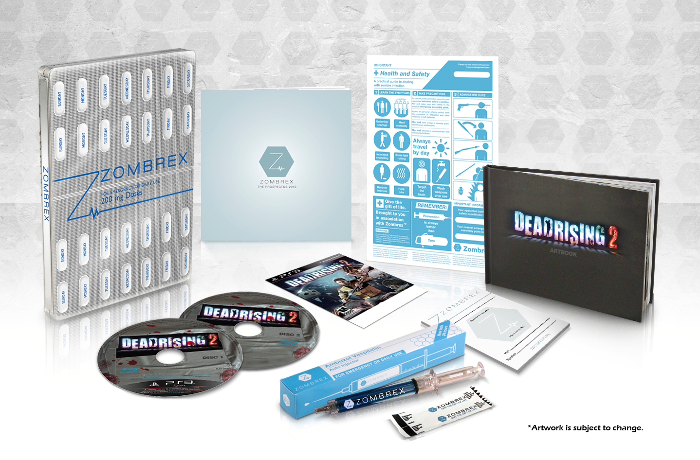Capcom USA has a limited edition bundle of Dead Rising 2 packed in a steelbook Zombrex case. While our bundle doesn’t include a desktop zombie, it has a ton of other zombie neutralizing goodies.