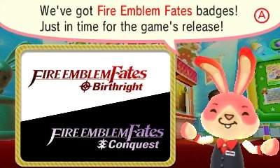New badges have been added to the Nintendo Badge Arcade. The newly available designs are based on Fire Emblem Fates, Nintendo and Intelligent Systems’ new strategic RPG. When someone visits the app, the sales rabbit will talk about the game, as well as offer a personality quiz to see which character you’d best match up with. (I was matched with Takumi.) Once that’s done, he’ll offer you one free play on a machine.