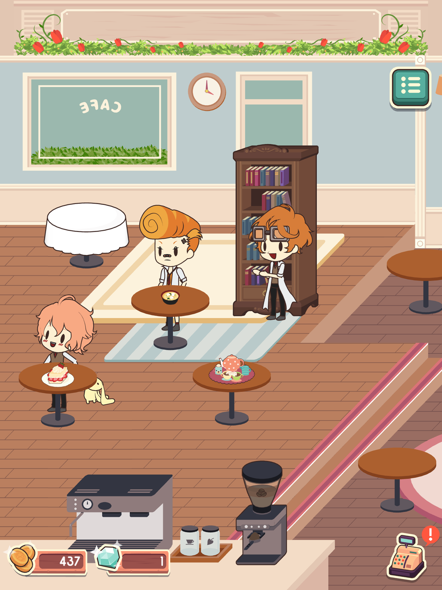 Fortunately, none of the money you earn has to actually go toward school fees. Instead, the 20 visiting boys will provide money after having some coffee and enjoying the various accoutrements placed around the area. This can be reinvested, improving the cafe. Visiting daily offers rewards like money and coffee beans, and stopping by every day for 15 days provides an item that attracts a specific senpai. You get five space to place items, and there are five kinds of coffee beans you can brew. The basic level is free, premium beans are 150 coins, gourmet beans are 200 coins, golden beans are 10 gems, and magic beans are 20 gems. Likewise, things in the cafe cost either gems or coins.