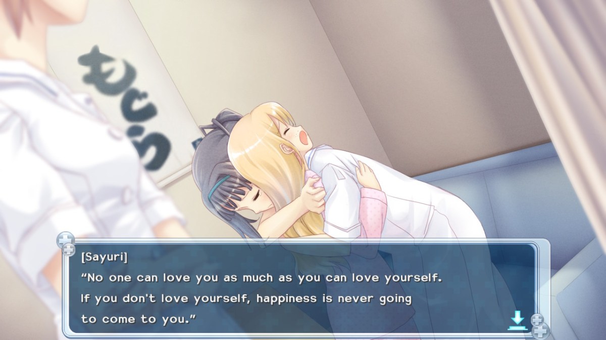 The English synopsis of Nurse Love Syndrome on both Steam and Nintendo eShop only lightly mention that the game is based off the Japanese re-release Nurse Love Syndrome Re:Therapy, which released two years after the original game with three new heroine routes for Yamanouchi, Ami, and Mayuki. Re:Therapy also added post-stories to the original three heroines’ routes, ie. Nagisa, Sayuri, and Hatsumi. This comes with the warts that you might expect a re-release to have. Despite scenes throughout the game fleshing out Yamanouchi and Ami, they never lose the feeling of being sub-characters in other heroines’ routes despite being heroines in their own right. Shocking revelations about their pasts come out of nowhere, and while the themes of their routes are still relevant to the overall theme of Kaori’s growth as a nurse, it feels tacked on. As for Mayuki, you can’t even meet her until you reach any ending once, and make a specific choice early in the game, as she’s literally separated from everyone else.