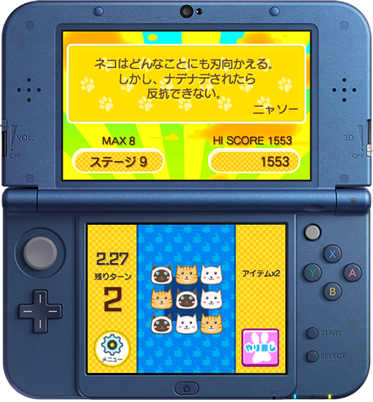Nyanyanto Mori is an incredibly catchy game. The gameplay is compelling, requiring you to quickly analyze situations and respond. It’s challenging, yet forgiving. Plus, it’s pleasing to the eyes and ears. The cats are adorable and soundtrack fantastic. The only unfortunate thing about it, aside from the whole death thing, is that the Miiverse community suggests a localization would use the title Same Color Cat Go Up!, rather than the more adorable Nyanyanto Mori. It’s an entertaining and import-friendly budget title, should anyone happen to have a Japanese 3DS with eShop credit on it lying around. I know it never failed to bring a smile to my face.