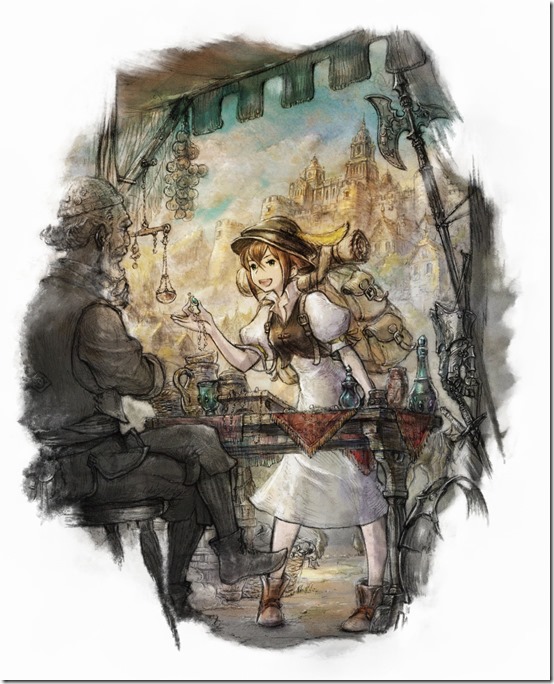 018 Square Enix shared a batch of screenshots and info for Octopath Traveler with more on two of its eight protagonists in Tressa and Alfyn along with details on Ability and Battle Job systems.   Tressa Corzione Base Job: Merchant Age: 18 Gender: Female 001 Tressa worked as a merchant at the lodging home run by her parents in the port city known as the Coastland Region. Tressa spent a lot of days lost in thought while looking at the sea. What do I want to do? What do I want to get? “What’s beyond the horizon?” And one day, a merchant ship arrives before her.   002 003 Tressa’s Path Action is “Purchase” that allows her to obtain special items from townsfolk. This includes items not sold in stores as well as items that might come in useful.   004 In addition to skills for attacking enemies, the Merchant job can use money to hire mercenaries, share BP with allies, and other situational methods of fighting. With the ability to recover their own HP and SP, having a Merchant around will come in handy for keeping down the item expenses.   Alfyn Greengrass Base Job: Apothecary Age: 21 Gender: Male 005 Alfyn is an Apothecary from a small town in the Riverland Region. When he was young, his life was saved by someone. It was an Apothecary who left him medicine without asking for pay. “I want to be like that person, and save people across the continent!” Alfyn has yet to set foot on his adventure, but one day a friend talks to him…     006 007 Alfyn’s Path Action is “Inquire” that allows him to gather information that you can’t get from standard conversations. With this ability, he can acquire useful information from the town shops, info on the whereabouts of hidden items, and can learn people who keep low profiles.   008 The Apothecary class has skills that recover HP as well as skills that recover status ailments, and even the ability to revive fallen allies. While they’re considered healers, the Apothecary can use an axe for powerful attacks to help out as a damage-dealer as well.   Learning Abilities 009 After defeating enemies you’ll earn experience points and JP (Job Points). The protagonists can use JP to learn new abilities for their jobs. Abilities can be learned in any order you like, so deciding on that will be part of the strategy.   010 Learning abilities that are easy to use early on will certainly help out in regular battles. However, learning big abilities that consume plenty of SP first might come in handy for taking out bosses and powerful enemies.   Equipping Battle Jobs After meeting certain conditions, the protagonists can equip something other than their Base Jobs, called the “Battle Jobs.” When equipped with a Battle Job, the character’s stats will be fixed according to the Battle Job and it also adds weapon types they’re able to use. They can also learn Abilities from those jobs. As for which job a character should have, players will get to choose for themselves as part of its strategy.   A character’s appearance also changes depending on the Battle Job they’re using. For example, here’s a look at Olberic Eisenberg using different Battle Jobs to go with his Swordsman Base Job:
