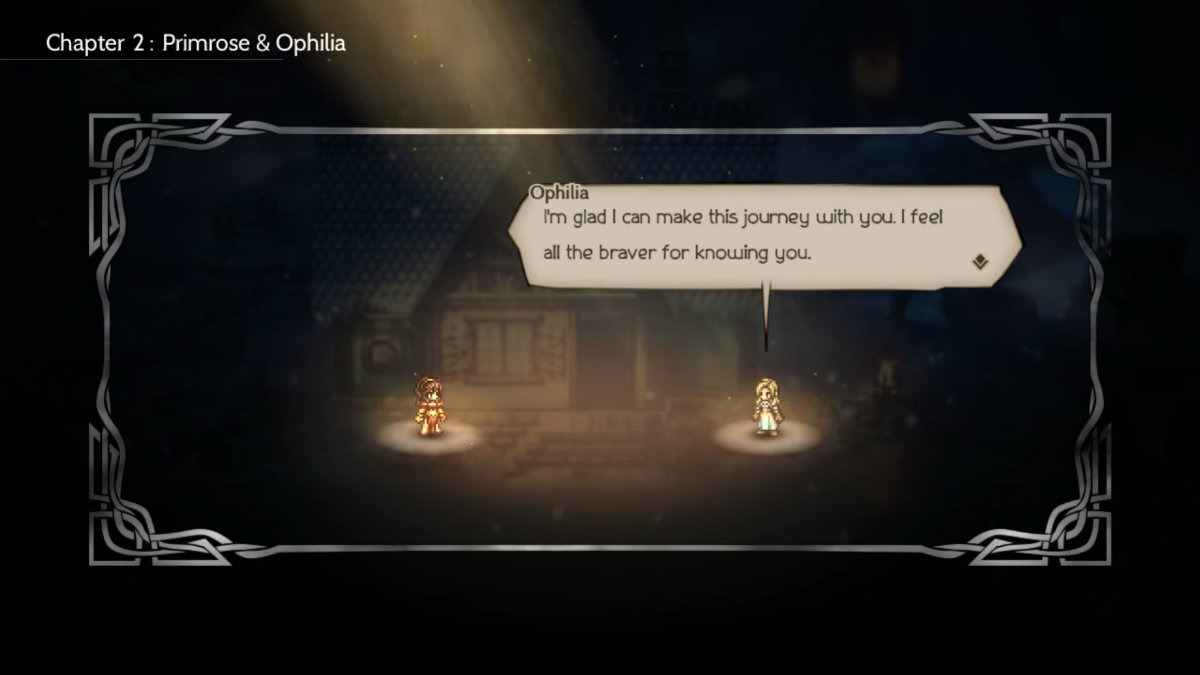 Much of the travel banter is rather topical, while still revealing information about the people participating in the conversation. As you have Tressa and Primrose spend time together, you will see something of a sibling relationship develop. Primrose seems to enjoy teasing Tressa, sometimes referring to her as a “minnow” or mentioning that her naiveté makes a transparent piece of jewelry suit her. Cyrus is fascinated by what Ophilia’s The Kindling journey entails. When Therion and Olberic speak, we realize what Olberic might have had to do in the name of the soldier. Particularly, he is quite insightful when it comes to possible ideas for breaking and entering.