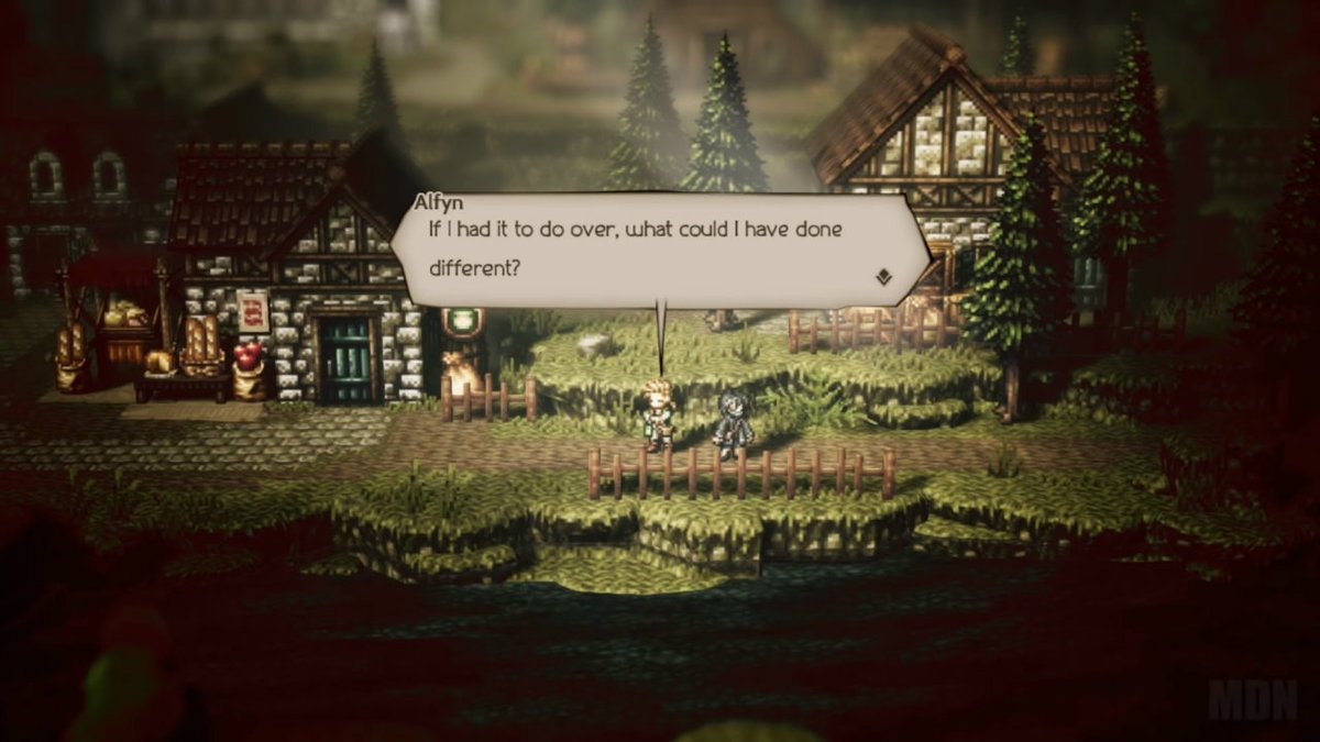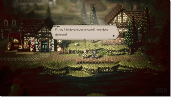 The stories in Octopath Traveler can get very personal, as people search for revenge, purpose or someone or something that is lost. Not seeing the other people around during the events can seem unrealistic. We very obviously know they are there, due to the battles going on and opportunities to use path actions. But I almost wondered if it was a sort of selective storytelling. It would help “explain” the chapter divisions. The “fin” images provided for each character almost make seem like this is a collection of short stories. Especially if you also factor in Tressa’s tale and the journal. I liked to think that each route in the game was perhaps being narrated by some unseen individual as I played, and I was only seeing the people who mattered during the most important moments (save for the Travel Banter).