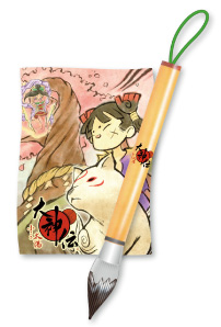 First run of the Japanese version comes with a paintbrush stylus and a microfiber cleaning cloth with cute Chibiterasu.