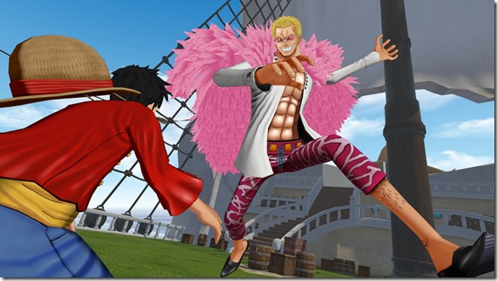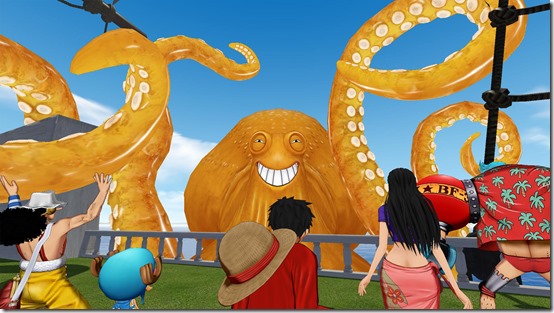 The shooting games in One Piece: Grand Cruise are fairly simple, and allow people to use either the DualShock 4 or Move controllers. Motion controls let you aim a cannon, and you press a button to fire. The Navy scenario involves trying to hit moving targets, as their ship fires an array of objects at yours. (Considering one of the things flying at me was a turkey leg, I found myself wondering if the Navy had a Slime Mori Mori Dragon Quest 3 rig.) In the Kraken scenario, which is a bit longer, you fire at tentacles until its head appears. Then, when its head shows up, you attack it. Once it is defeated, you are treated to a Doflamingo cameo. Other red and blue characters will participate to aid in the fight, to act as filler, and can often make this already easy shooter even simpler.