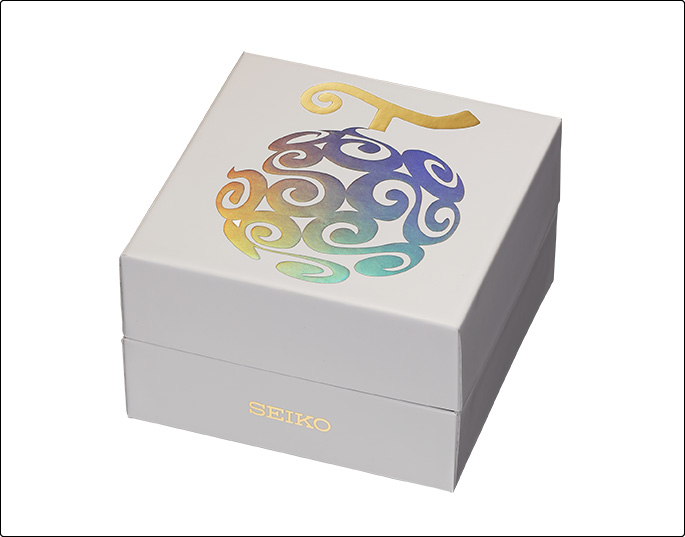 The watch has Luffy D. Monkey’s name engraved around the dial, and the subdials include motifs from Luffy’s Gear 5 transformation, as well as the Gum-Gum Devil Fruit. Additionally, the Straw Hat Jolly Roger appears alongside the One Piece and Seiko logos. The box includes a Gum-Gum Fruit motif, and the interior features an illustration of Gear 5 Luffy.