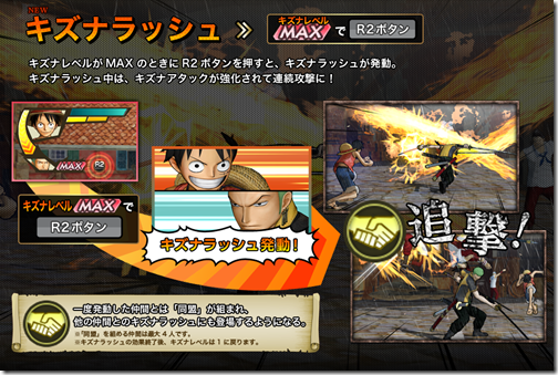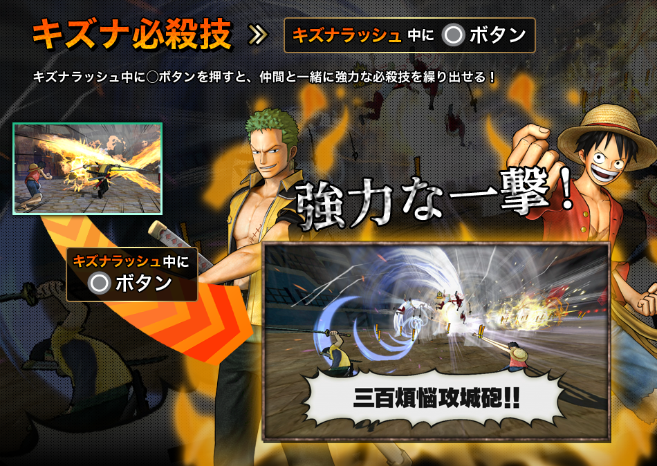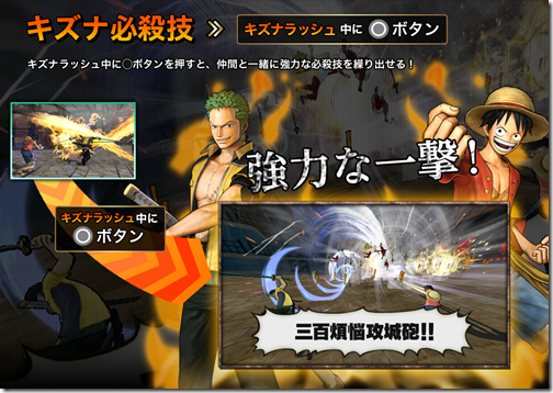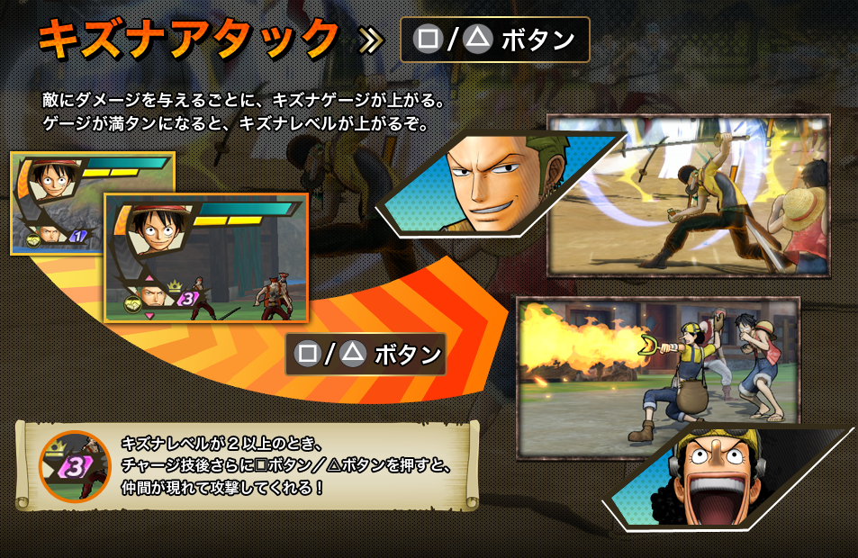 One Piece has always been about friendship, and Pirate Warriors 3 reflects this with the “Bond Attack” system. When damaging enemies, you’ll increase your Bond Parameter, and once it fills up, your bond level increases. After getting bond level 2, you can press the square and triangle buttons, to have a friend show up for an assisted Bond Attack.