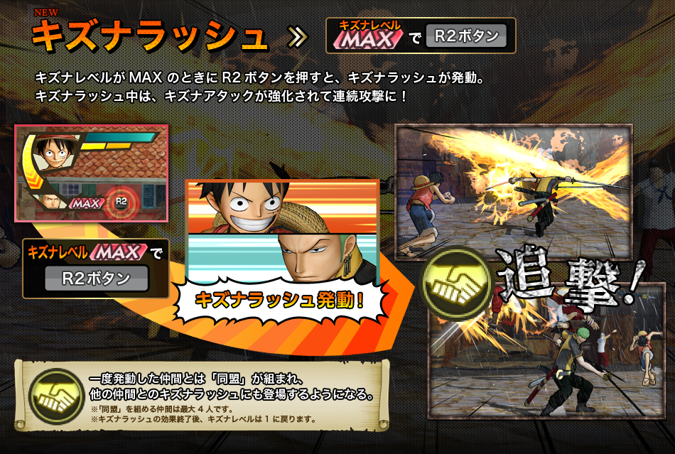 The “Bond Rush” is activated by pressing the R2 button when the bond level hits its max. During the Bond Rush, your Bond attacks become stronger, and also into combo attacks. Your Bond level goes back to 1 after use. After activating a Bond Rush with a friend, you’ll form an “Alliance” with them, which allows you to call them out for Bond Rushes with other characters. You can have up to four characters for your Alliance.