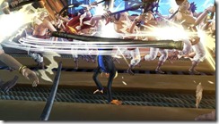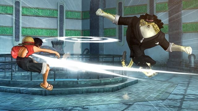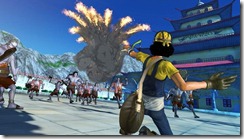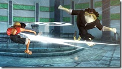 Not everything is free-for-all button-mashing fighting, though. In both the Musou (especially in the final boss battle) and the Action parts of the Main Log (the main story), Pirate Warriors uses “platforming”. In a pseudo-action game manner, you control Luffy through mazes of enemies and obstacles trying to reach one destination or another. The obstacles are rather ingenious, too, with Luffy using his rubber elasticity in all sorts of manners to fling, cling, and swing from one platform to the next. These are fun and serve to let you see more of the One Piece islands that were never really explored in the manga such as Water 7, and they do break up the tedium of Musou battle after battle nicely. They also fit snugly into the established plot, which is nice. (The faithfulness of the game in the scenes it does depict is wonderful. About the only complaint I have in this regard is that the costumes aren’t consistent with their costumes in that arc, but of all the problems they could have had, that’s one of the better ones.)
