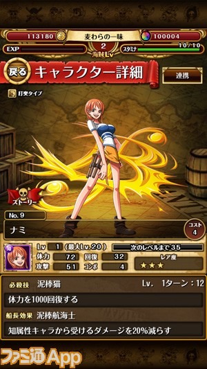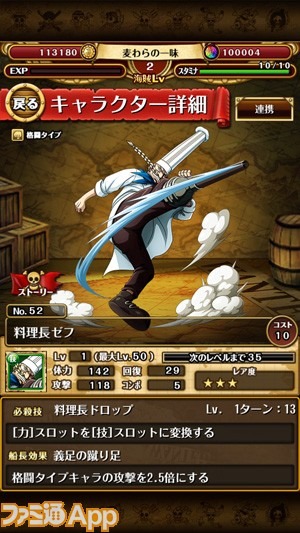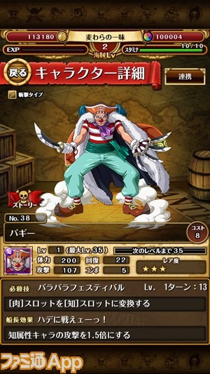 Similar to the Puzzle & Dragons games, the characters can evolve upon meeting certain conditions. For example, Alvida is shown evolved into her form after eating the Sube Sube no Mi, and increased all her parameters.