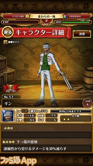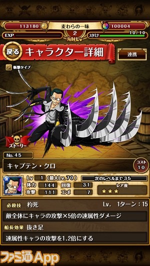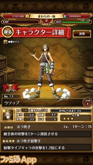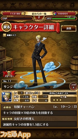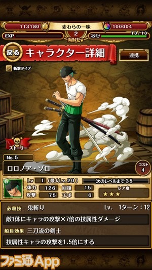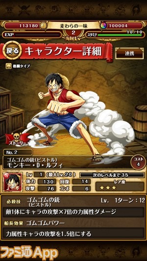 They also seem to have various attribute-types, such as skill, power, speed, heart, and wisdom (although, it does seem strange to see Zoro with “wisdom” and Usopp with “power”)