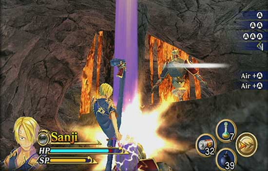 Gameplay revolves around exploring the various areas of the island while trying to solve the mystery of the orb that has mysteriously come into Luffy's posession. Opening up new areas requires finding Orb Points, where you can use the orb to cause changes in the surrounding environment, opening up new paths. However, activating these Orb Points requires you to feed the orb various items you'll have to search for along the way. During your journey you'll of course come across plenty of enemies. From your standard Navy grunts to classic One Piece villains like Smoker, Kaku, and Don Kreig, you'll fight enemies aplenty along your journey. The fighting engine in the game is fairly well done, but the downside is the camera. Oftentimes you'll lock on to an enemy and still barely be able to see them due to the game's wonky camera. Most of the time you'll likely find that it's easier to just not lock on to enemies. Fighting is handled with a mix of button presses and Wii Remote motions, but mostly button presses. All eight playable characters (Luffy, Zoro, Sanji, Robin, Nami, Franky, Usopp, and Chopper) have their own set of unique moves. From the start you'll only have one to two hit combos at your disposal. As you fight your way through the game though, you'll learn new moves. Luffy's Gum Gum Bazooka, Usopp's Shuriken Shooting Star, and Sanji's Anti Manners Kick Course will all be at your disposal in time.