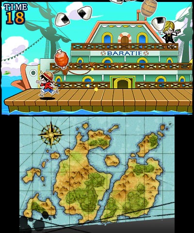 If you’re not too keen on fighting all the time, there’s also some mini-games scattered throughout RED that aren’t the harvesting or bug catching sections. One of the more hilarious ones is a 2D side-scrolling game where Luffy runs around the pier as Sanji tosses food and other things at him. Eat the food, miss the pots sounds like a really simple game (and it is) but we probably shouldn’t knock something that’s free and thrown in as a very cool nonetheless extra. One Piece Unlimited World: Red is out now for Nintendo 3DS.