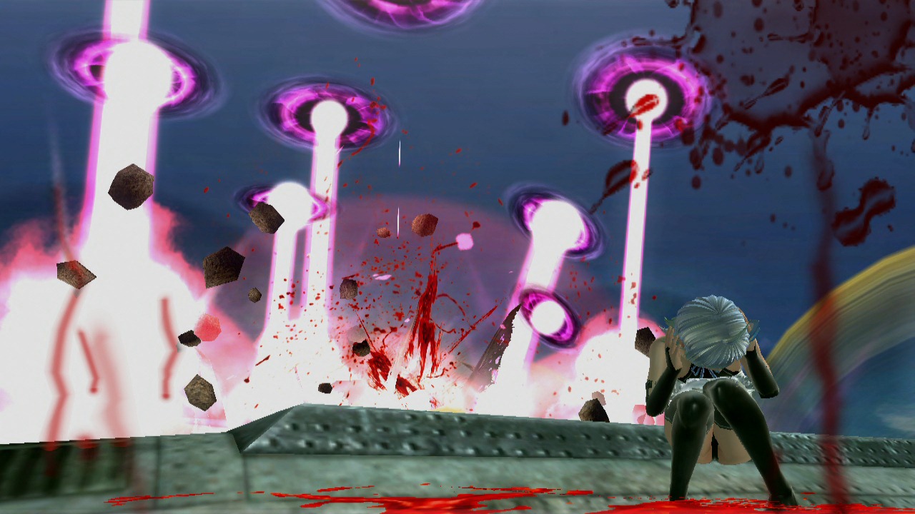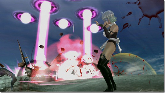 Unlike Kagura’s sword antics or Saaya’s chainsaw madness, Nonono fights primarily with the power of the future. She’ll have two gloves that seem to be able to generate different forms of energy – which can be used to become lightsaber-y slicers or fire off projectiles. She can also whip out a futuristic rocket launcher. Nonono also gets her own special energy gauge called Futuristic Ecstasy. The gauge gets powered up as you hit foes and stores up to three levels. When she’s in a pinch, she’ll literally call in reinforcements from the future, creating multiple time portal rips above foes that shoot ion cannon beams straight down on the zombie hordes.