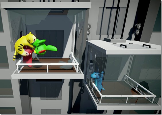 Gang Beasts puts players in control of one of several gelatinous characters and sets them to work beating on each other in varied environments. Players can grab onto any body part or object, then proceed to throw, shove, or beat on it as they dangle from window cleaning scaffolds, ride on moving trucks, or tumble from unattended ferris wheels.