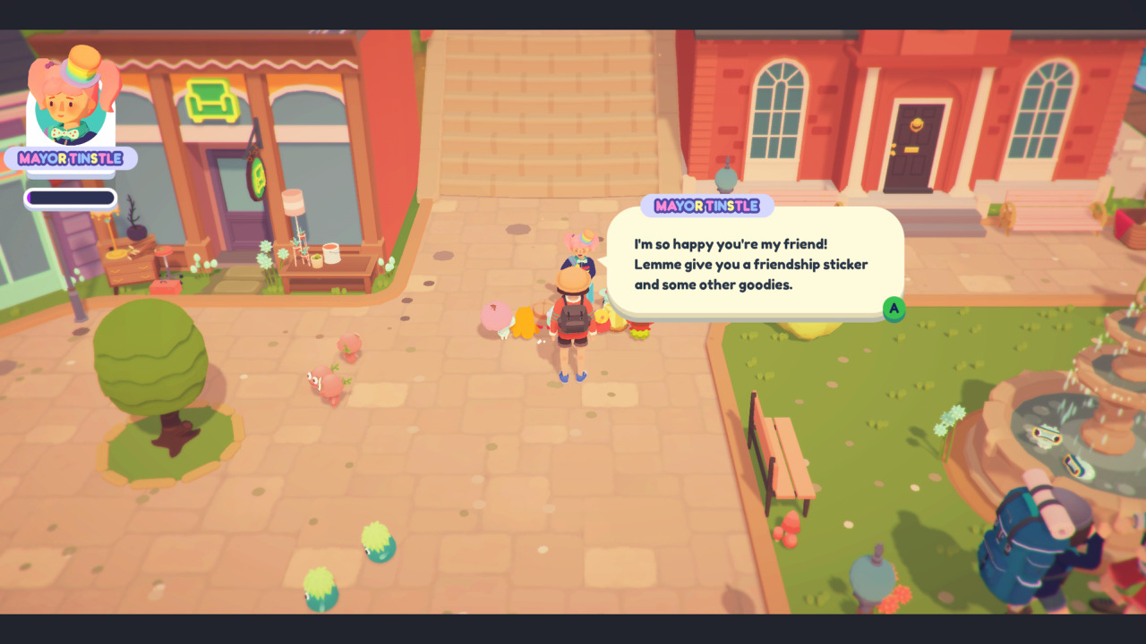 Before you can start befriending people in Ooblets, the game presents you with a task. As the town’s newest resident, Mayor Tinstle makes you an assistant and tasks you with making it a better place to live. Part of this involves Ooblets’ Friendship Sticker Printypress. This used to be an initiative to encourage people to socialize via earning stickers, but its broken. To fix it, you need to collect a sweetiebeetie, six sporbets, and ten nurnies. Sweetiebeetie seeds are five gummies each at Meed’s Seeds. You can get the nurnies by breaking rocks on your farm. The sporbets are random, common items found around Badgetown. Dropping them off fixes the press, and now whenever you talk to certain townsfolk, you’ll build up a rapport.