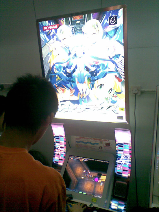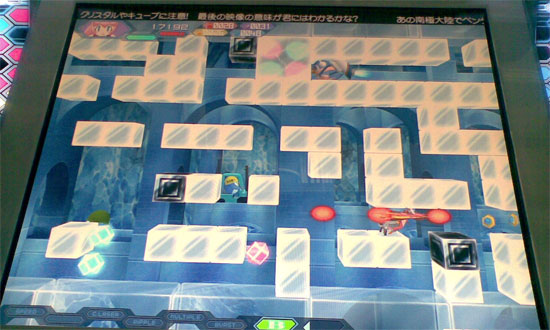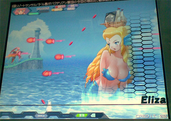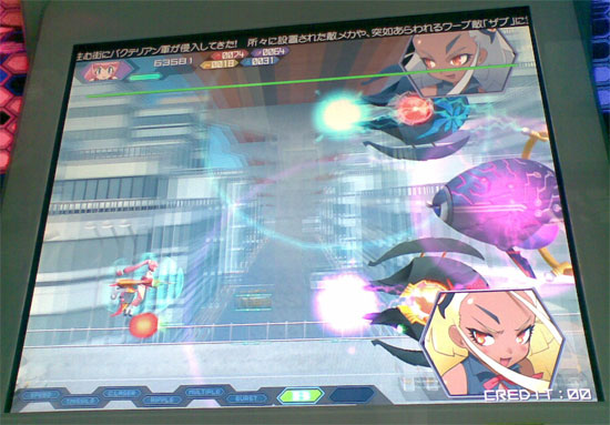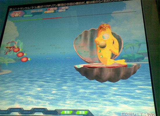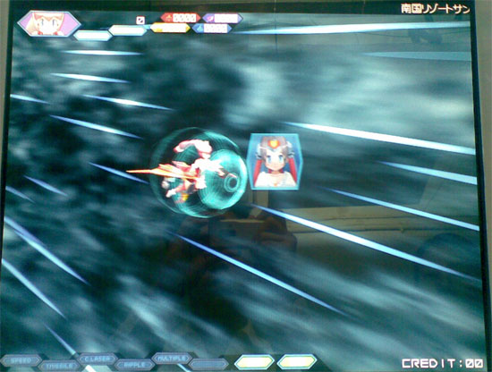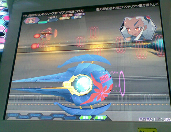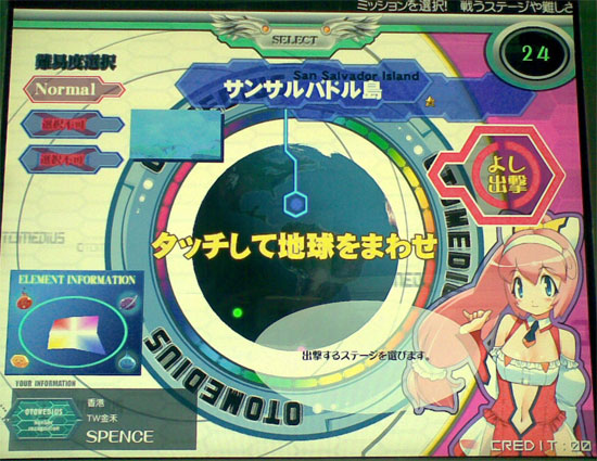 I had a chance to try out Otomedius, a shmup from Konami, which feels like a spiritual successor to the Parodius series. Similar to Gradius V the graphics, including character models, are in 3D, but you don’t fly a ship in Otomedius. Instead you pick one of the moe style girls or single guy with the touch screen. You can scroll through a list of four initial characters, each tethered to an element, to see which weapon list you want. Once you pick your character you can choose a stage by spinning the globe with your finger. Nifty.