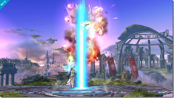 At E3, Nintendo revealed Palutena as a playable character in Super Smash Bros. Last night on Miiverse, director Masahiro Sakurai showed off her Smash Attack (above) and another one of her moves, emphasizing her range and reach.   Sakurai posted the screenshot above, stating: “I talked about an attack with a far reach in yesterday’s post, but it didn’t compare to Palutena’s up smash attack! No joke, it reaches really far. It reached so far in this shot that even the rocketbarrels got blown up.”   He added, alongside a second screenshot: “That said, if we’re talking just about range, even that can’t beat Palutena’s power, Heavenly Light. It has quite a damage field. However, this is a no-flinch attack, which means the opponents won’t react to the damage!”   Super Smash Bros. is in development for Wii U and Nintendo 3DS.