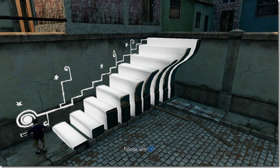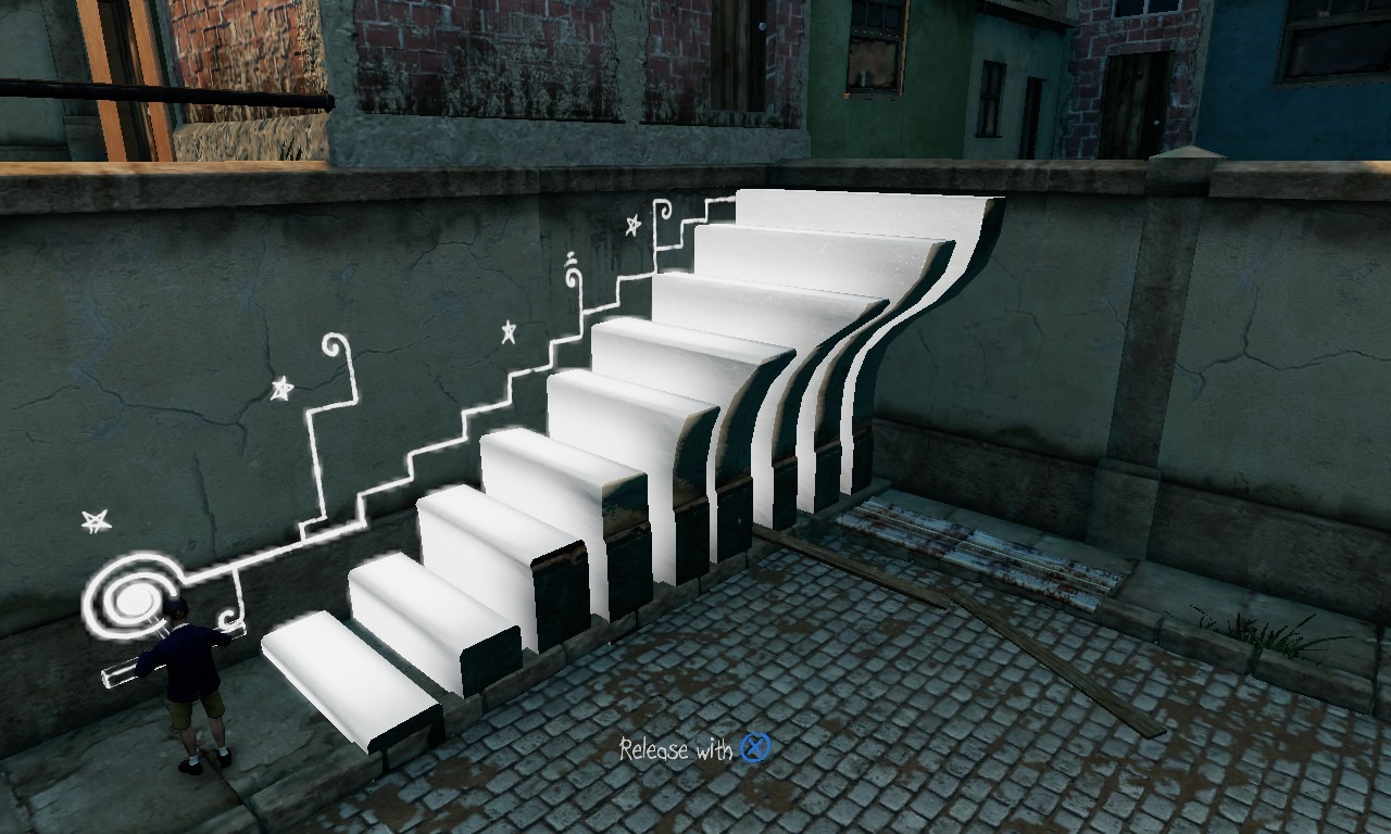 The favela’s streets and rooftops prove to be far more uncanny deep down than they initially let on. Various chalk drawings litter the area in various shapes—handles to be pulled, keys to be spun, gears to be pushed into place, as well as streams akin to power lines that indicate where each trigger can possibly affect. Manipulation of the environment plays a large part in Papo & Yo’s platforming aspect, but the essence is less in discovering how and where to manipulate the surroundings (which is quite obvious most of the time) and more in the curiosity of what sort of uncanny changes will occur upon triggering. For example, pulling a handle might raise a set of stairs out of nowhere, whereas a key may make the object it’s stuck in suddenly sprout legs and start walking. Without giving away too much, it’s at least safe to say that Papo & Yo has no shortage of intrigue when it comes to environmental secrets. That being said, going further into the game made it clearer that the game’s primary feature isn’t the platforming, but setting up various moods for the player.