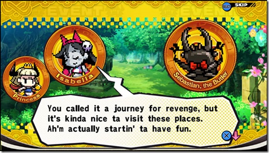 The makeup of Princess’ court also helps maintain a sense of balance. Princess is this hardened individual. The whole second chapter of the game focuses on how she went from having a beautiful and miraculous smile to developing a constantly growing forehead wrinkle from her furrowed brow. She does not shy away from battling through opponents. Sebastian talks a big game, but is quick to hide behind Princess and let her do all the work. He is a bit of a blusterer, but is well intentioned. Then, there is Isabella. Isabella balances out both of them by being this largely positive person. She is still there for Princess and ready to help out, but she is actually enjoying this journey for revenge and the opportunities it affords.