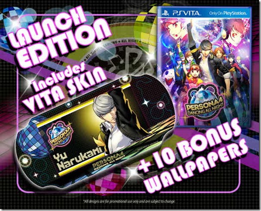 The Disco Fever edition will be sold in limited quantities, and will cost $79.99/CA$99.99. Meanwhile, the regular launch edition of Persona 4: Dancing All Night will cost $49.99/CA$59.99. Pre-ordering either version will also allow one to avail a PlayStation Vita skin (above), and 10 Vita wallpapers.